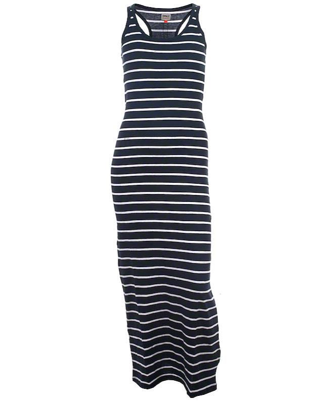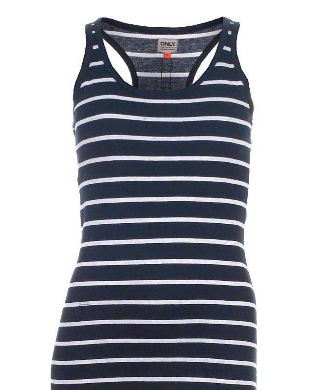 Lang ærmeløs kjole i stribet sort og hvid fra Only. Modellen har bryderryg. Findes i flere farvevarianter.